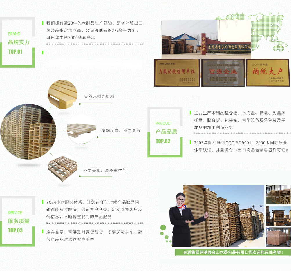 金源集團蕪湖金山木器包裝有限公司是省外貿出口包裝品指定的供應商,主要生產木制品墊倉板、木托盤、鏟板、免薰蒸托盤,膠合板,包裝箱、大型設備現(xiàn)場包裝及半成品的加工制造業(yè)務。產品廣泛用于物流,倉儲,港口,碼頭,機械,建材,化工,紡織,食品,超市,五金電器等行業(yè)。公司占地面積2萬多平方米,注冊資金壹佰壹拾捌萬圓整,公司擁有員工160多人,其中技術人員占25%,可日均生產3000多套產品,年產值6000多萬元,公司下轄木材加工廠,組裝廠,并備有大型標準烘房,多功能平板刨,壓刨,挖槽,機械設備等。產品主要銷往國內大中型城市并隨貨通行出口國外。